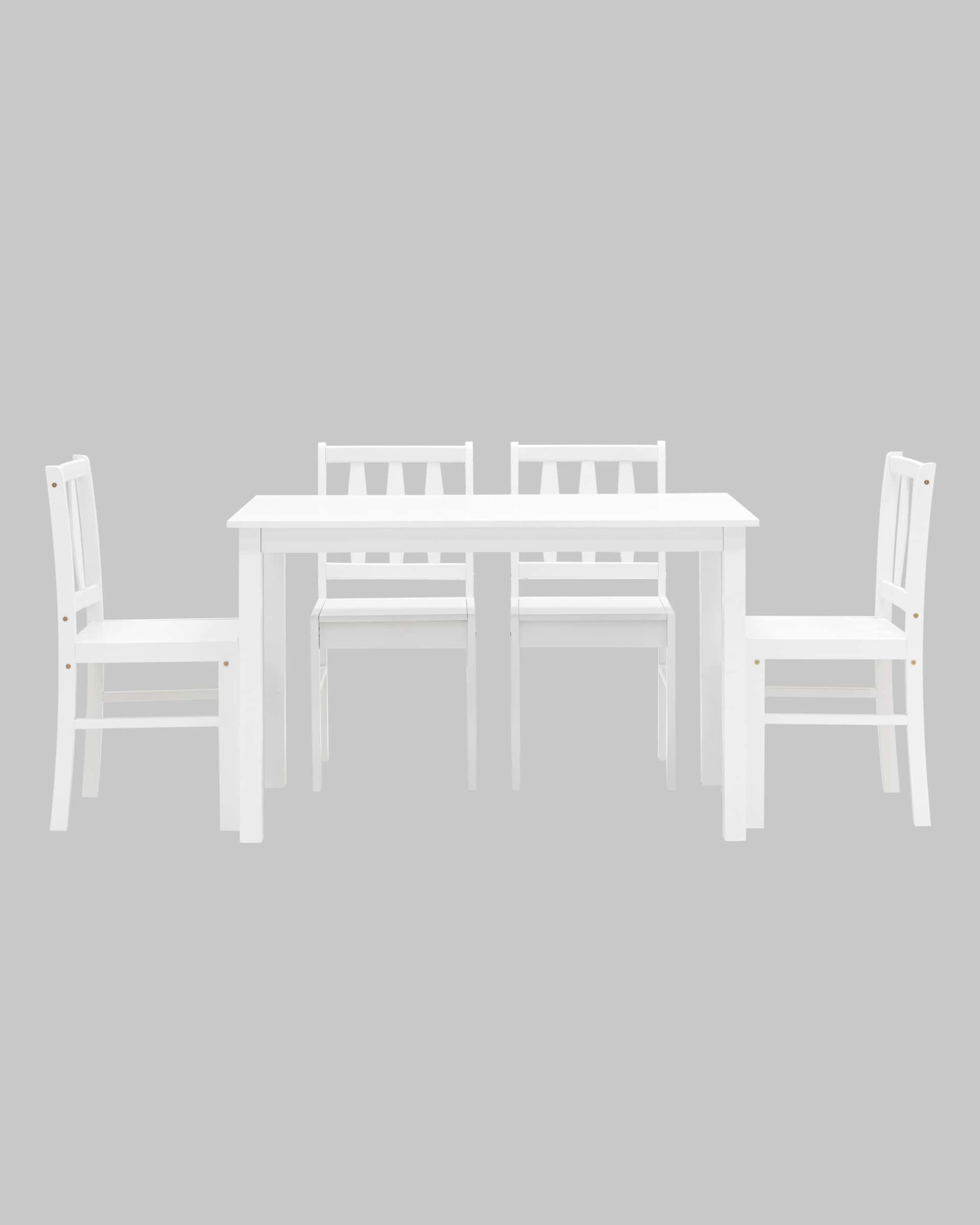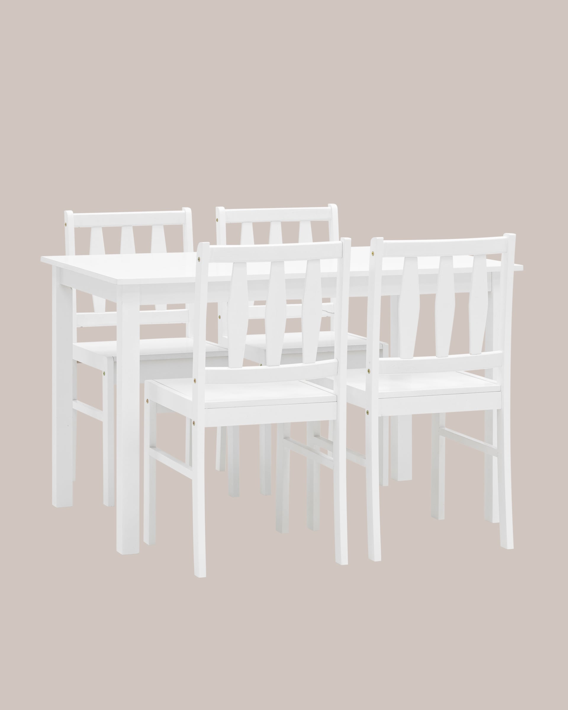 Стулья и ножки стола выполнены из массива дерева гевеи, которое отличается высокой влагостойкостью, устойчивостью к изменениям температур и прочностью. Цвет стульев и стола - белый, классический вариант для любой современной кухни.