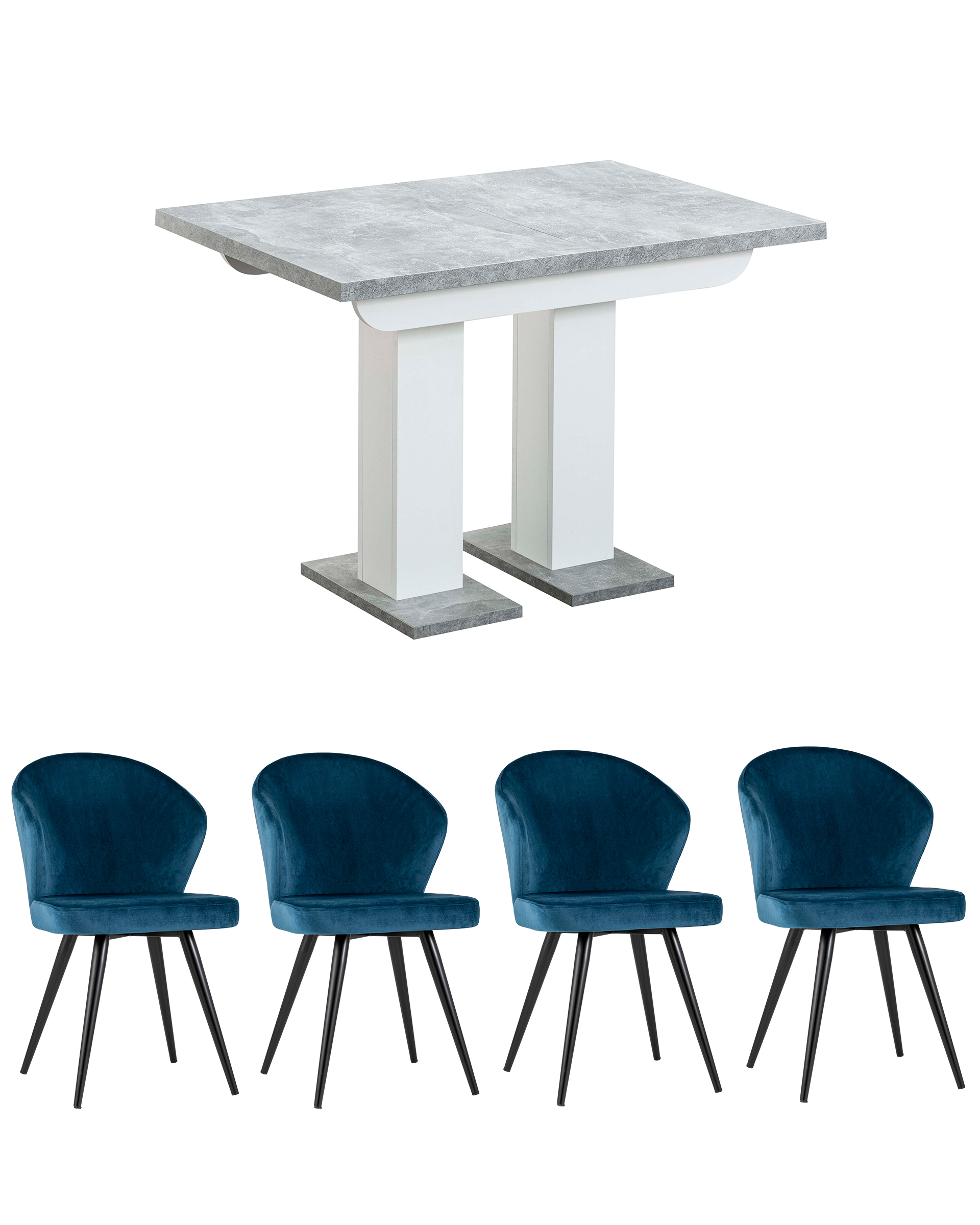 Столешница стола покрашена под бетон, что сразу привлекает внимание и придает интерьеру уникальности, ножки белые. В сложенном виде размеры столешницы компактные: 110*75 см. Дополнительная вставка в цвет столешницы позволяет увеличить длину стола с 139 см до 168 см.Для того, чтобы разложить стол, необходимо аккуратно снять зажимы с боков столешницы, затем достаточно потянуть за одну из половинок столешницы, извлечь вставки из-под основания стола, аккуратно уложить одну или сразу две вставки на основание, попадая в специальные пазы, и сдвинуть половинки. Не забудьте снова закрепить зажимы. С таким механизмом легко справится даже подросток.Стол комплектуется 4 стульями Танго в синем велюре. Такое решение выглядит особенно изысканно.