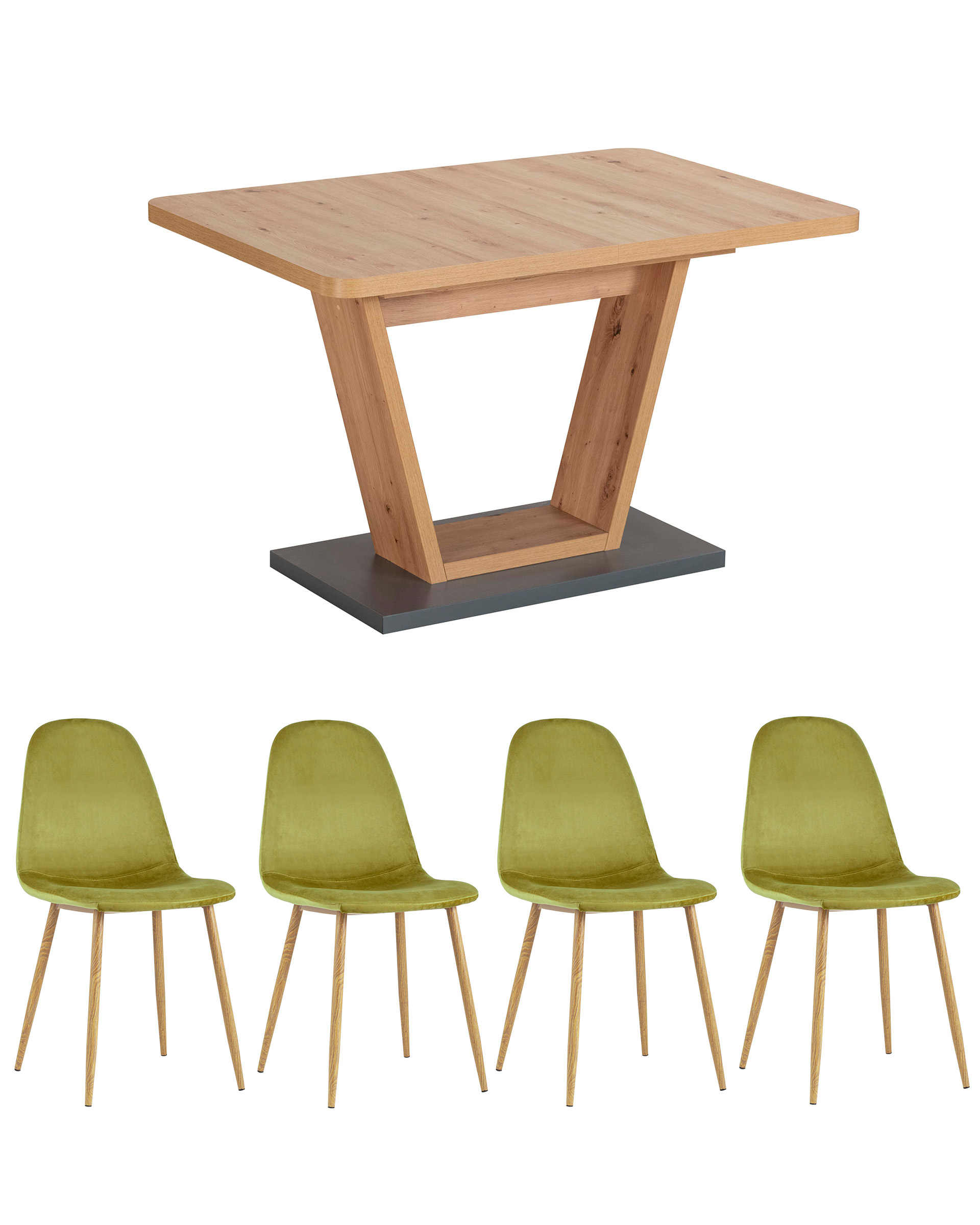 Стол оснащен синхронно-раздвижным механизмом со штопором. Разложить столешницу не составит труда даже подростку. Для того, чтобы разложить стол, достаточной потянуть за одну из половинок столешницы, вторая половинка при этом раздвинется автоматически, далее следует извлечь цельную вставку из основания стола, аккуратно уложить ее на основание, сдвинуть половинки и закрепить специальным зажимомСтол комплектуется 4 стульями Валенсия в обивке из мягкого велюра. Ножки стула в цвете светлого дерева гармонируют с цветом столешницы.
