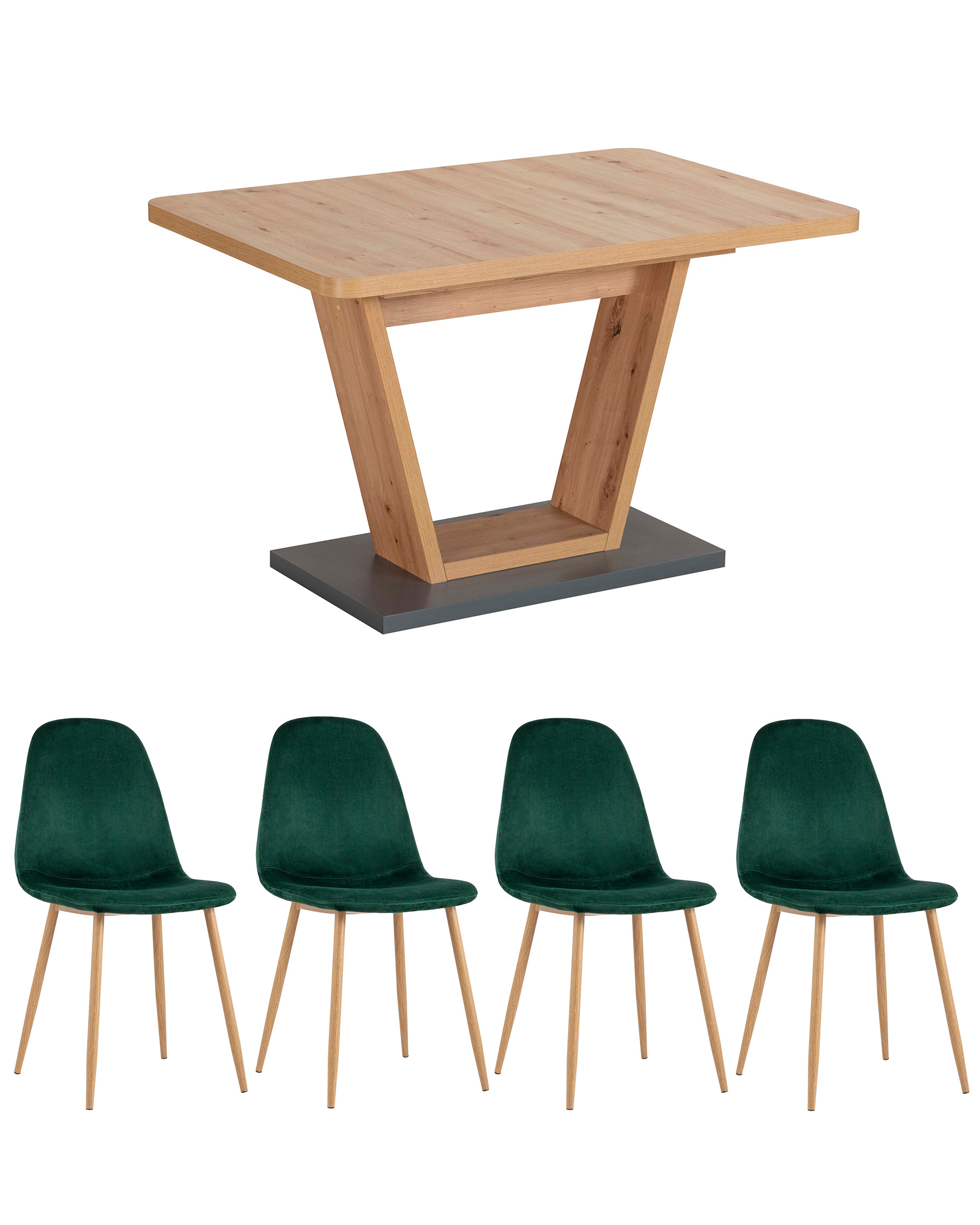 Стол оснащен синхронно-раздвижным механизмом со штопором. Разложить столешницу не составит труда даже подростку. Для того, чтобы разложить стол, достаточной потянуть за одну из половинок столешницы, вторая половинка при этом раздвинется автоматически, далее следует извлечь цельную вставку из основания стола, аккуратно уложить ее на основание, сдвинуть половинки и закрепить специальным зажимомСтол комплектуется 4 стульями Валенсия в обивке из мягкого велюра. Ножки стула в цвете светлого дерева гармонируют с цветом столешницы.