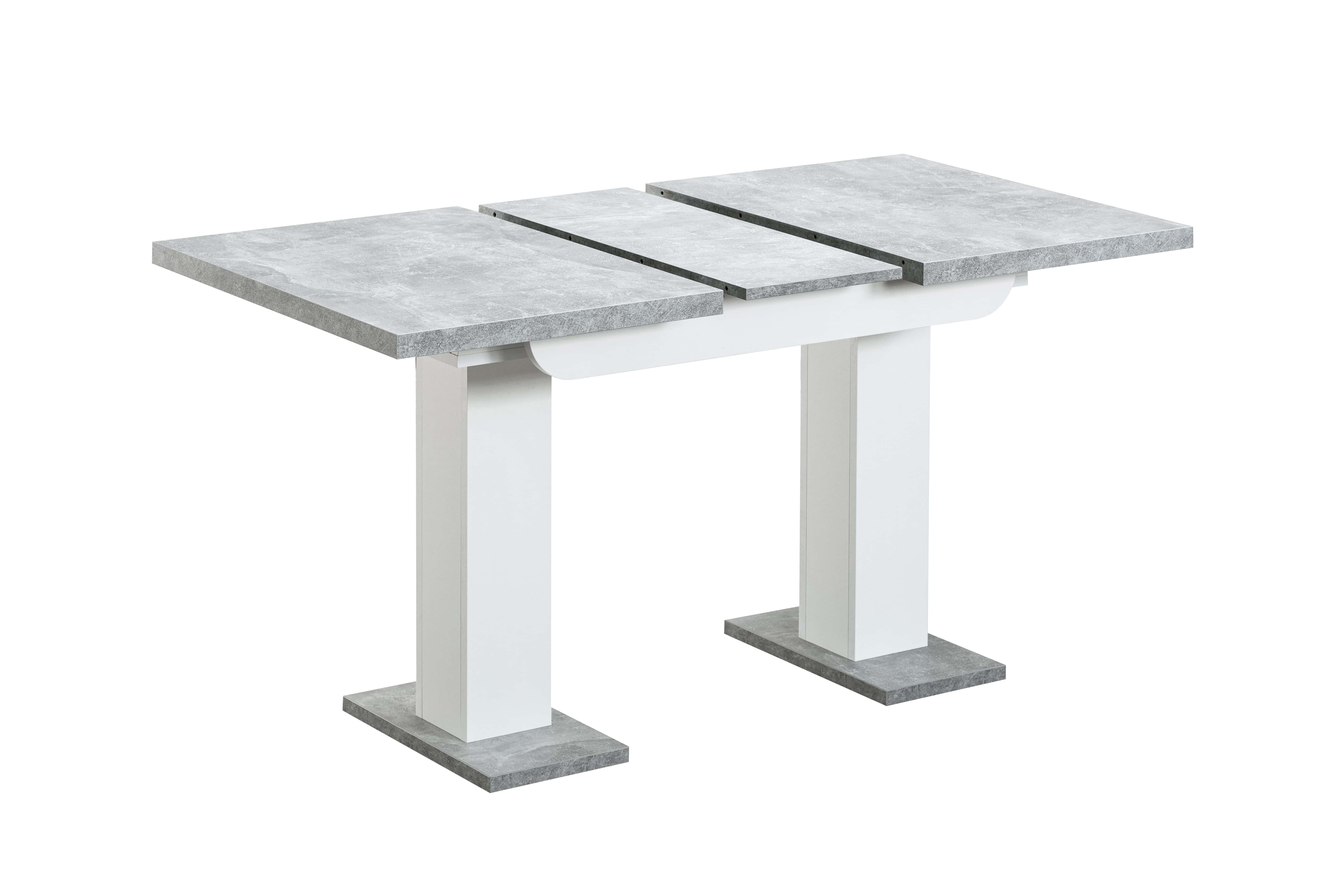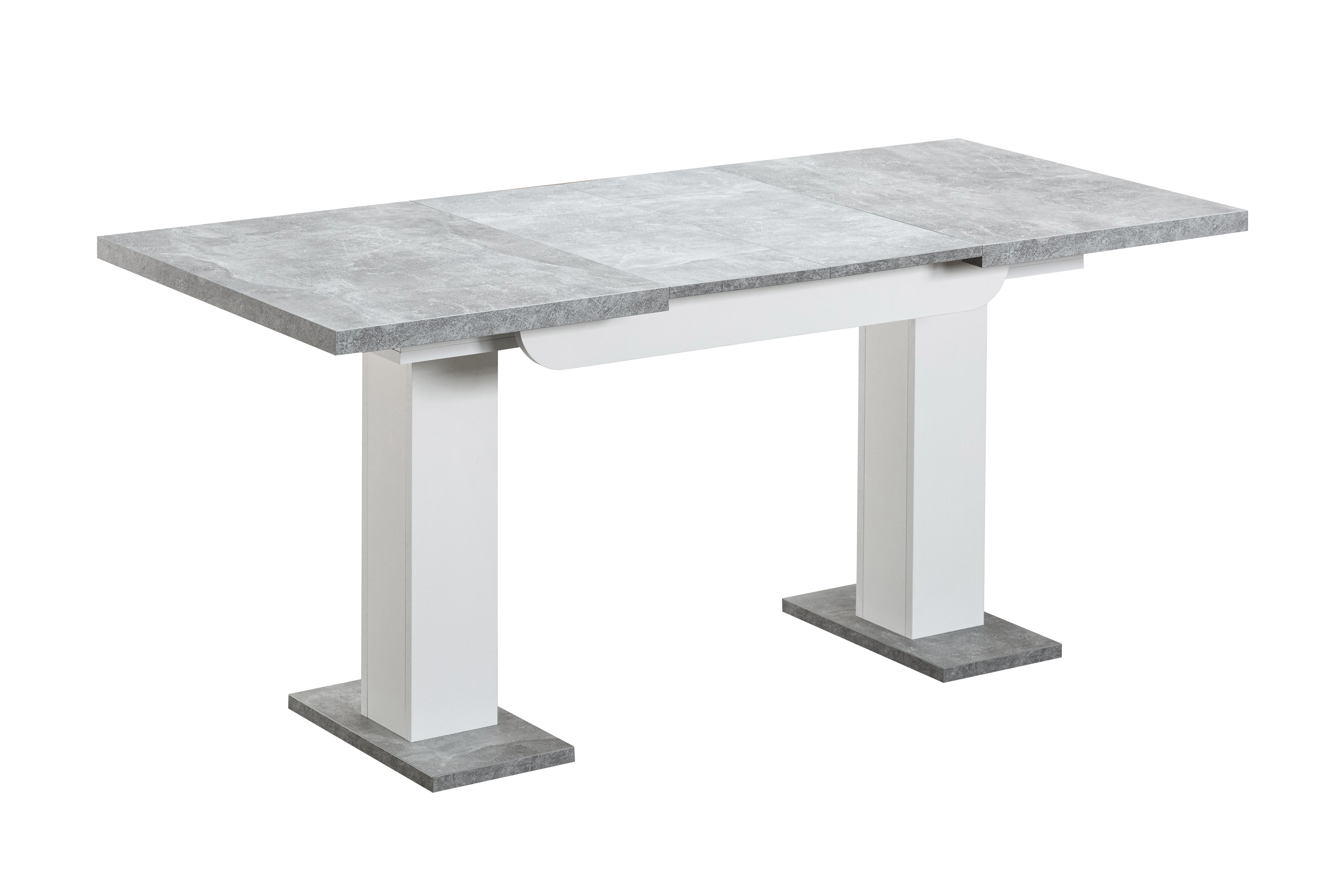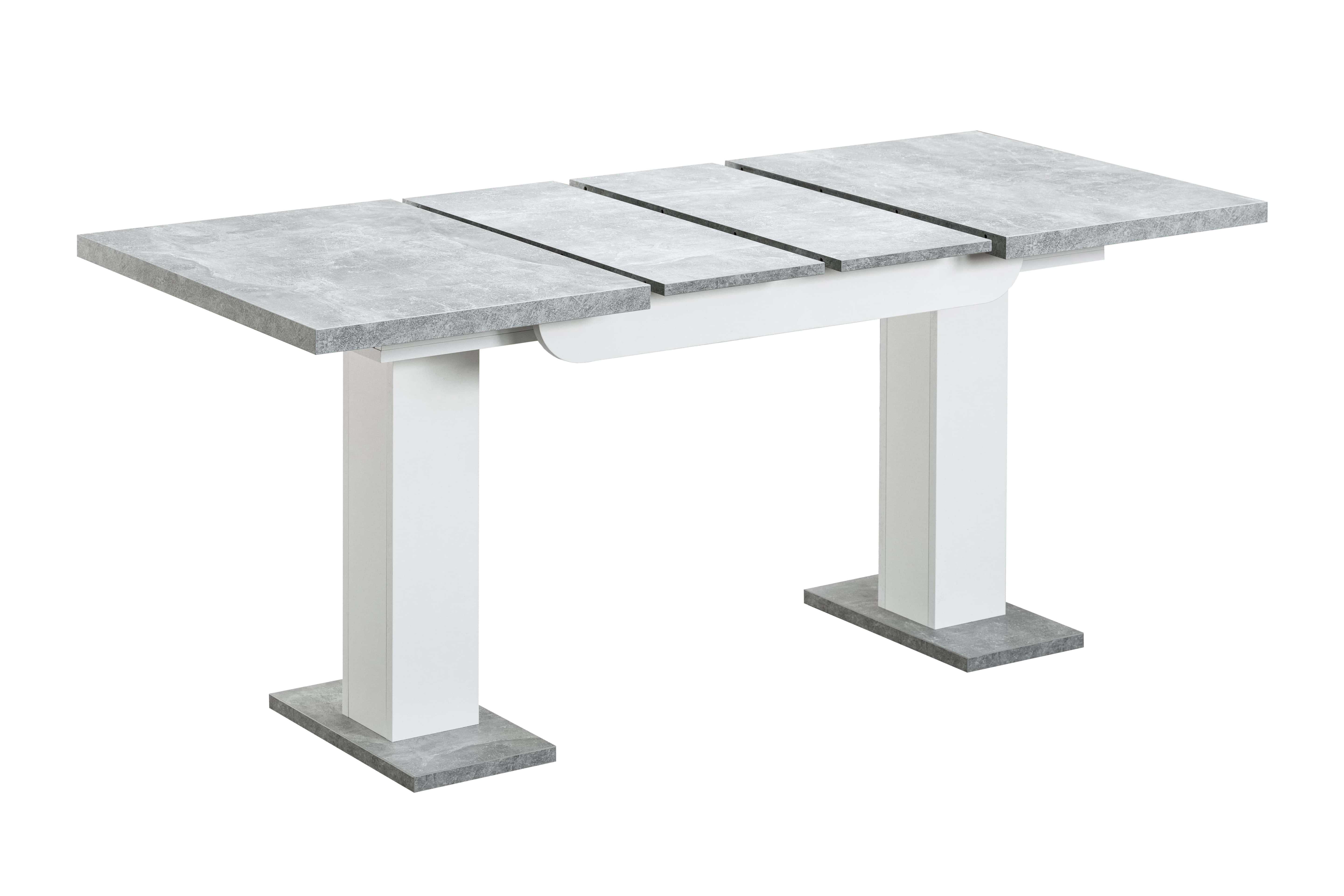 Столешница цвета бетона с красивым рисунком. Ножки стола состоят из двух частей белого цвета и опоры под ножками в цвет столешницы.